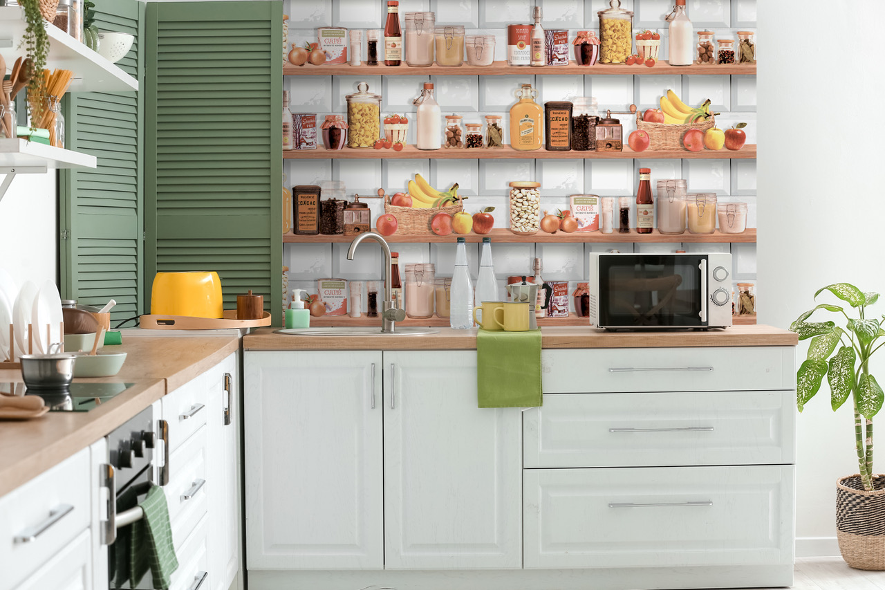 Met dit behang breng je het hart van de keuken tot leven. Denk aan open planken vol glazen potten met pasta, geurige kruiden, koffiebonen en kleurrijk fruit. Alles staat netjes opgestapeld en straalt warmte, huiselijkheid en een vleugje ambacht uit.