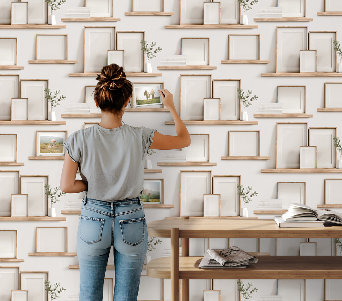 Dit bijzondere behang toont planken vol lege fotolijsten – stil, stijlvol en verrassend inspirerend. Elke lijst wacht op een verhaal, een herinnering, een moment. Het resultaat is een speels en kunstzinnig patroon dat uitnodigt om te dromen en je eigen betekenis te geven.