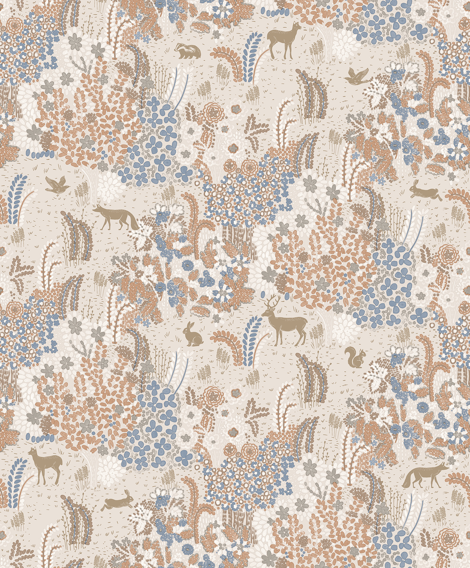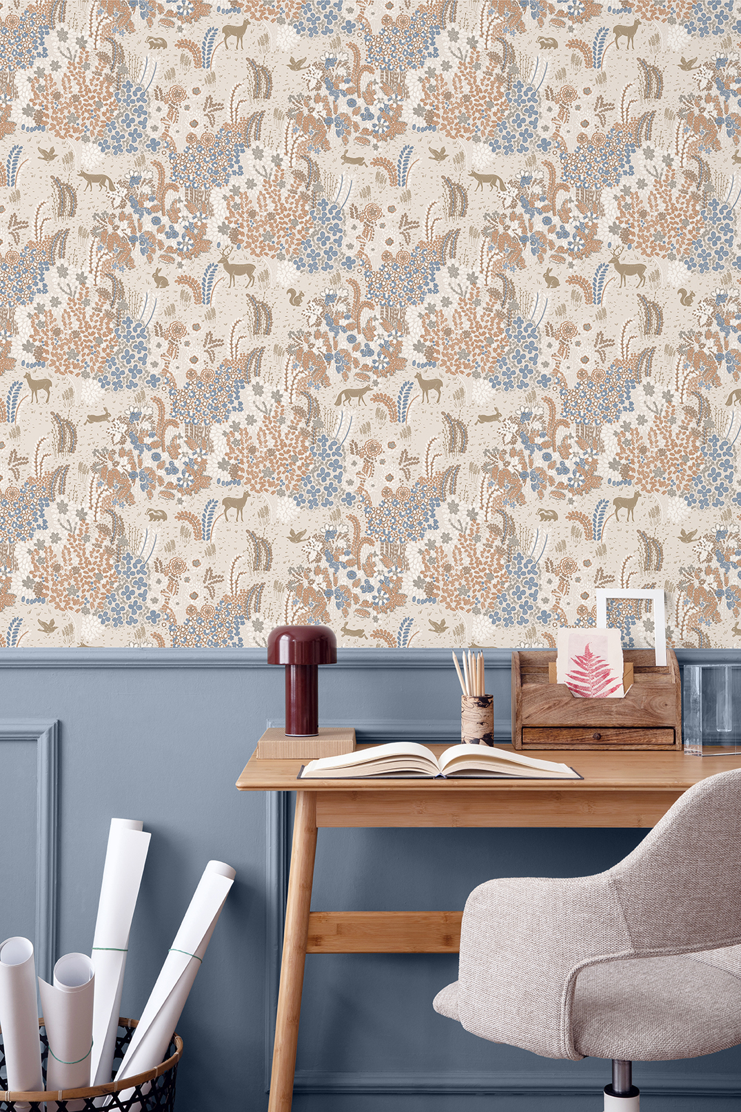 Dit behang brengt je midden in een levendig boslandschap, waar robuuste bomen en karaktervolle bosdieren samen een krachtig decor vormen. Elk detail straalt natuur, beweging en energie uit – alsof je even stilstaat tussen de stammen, met het geritsel van bladeren en het gefluister van het woud om je heen.