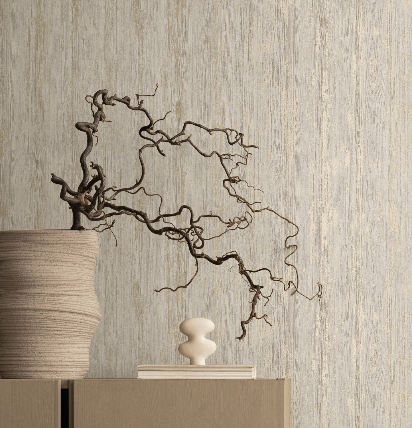 Sapele vangt de schoonheid van verweerd hout in een luxe behang. Het dessin laat subtiele nerven en panelen zien die doen denken aan oud, doorleefd hout. Metallic accenten zorgen voor een modern contrast en laten het licht mooi spelen over het oppervlak.