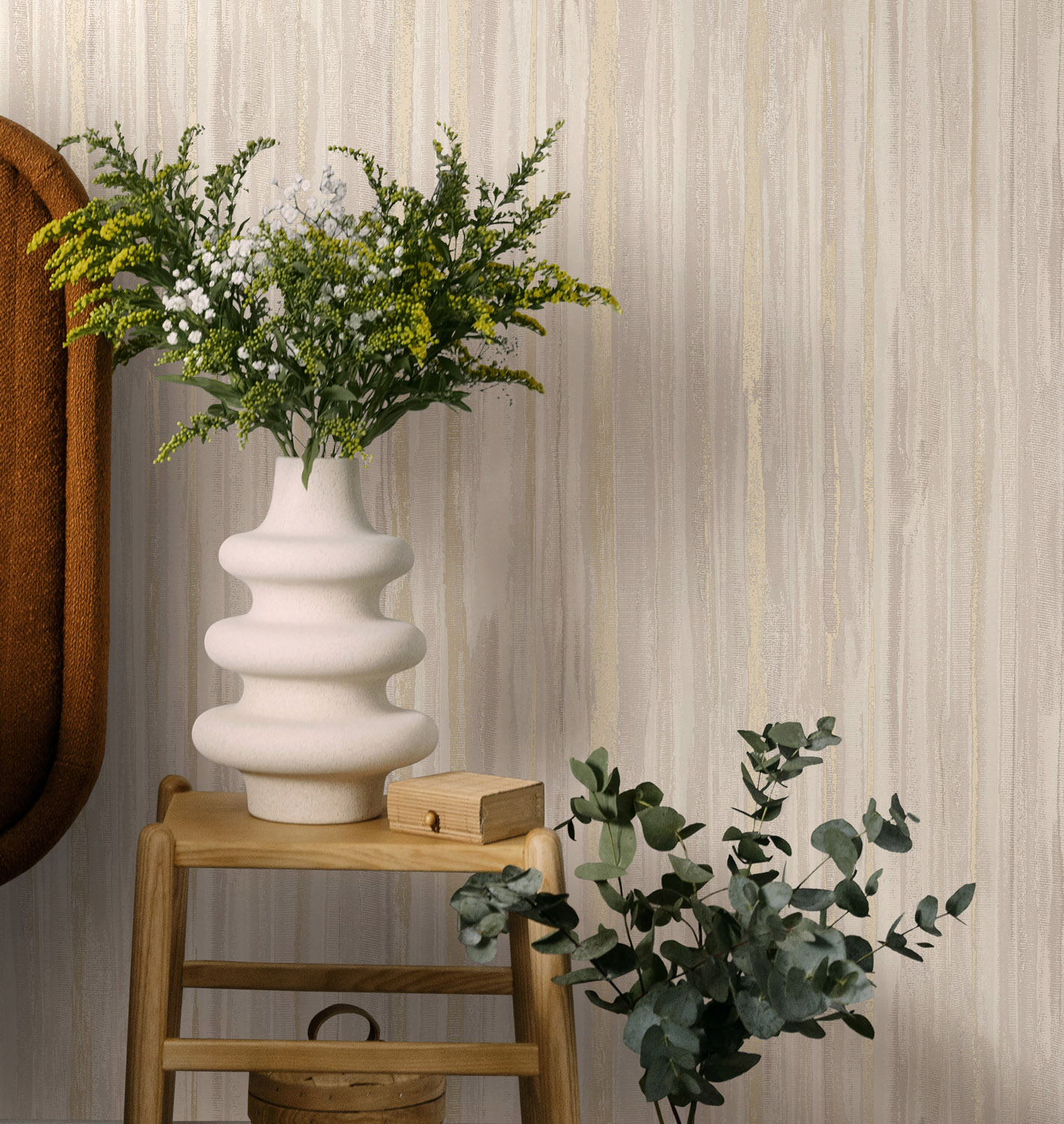 Calico valt op door z’n gestructureerde strepen en vloeiende penseelstreken die beweging brengen in je muur. De mix van matte texturen en metallic details laat het licht prachtig spelen en geeft het ontwerp een luxe, levendige uitstraling.