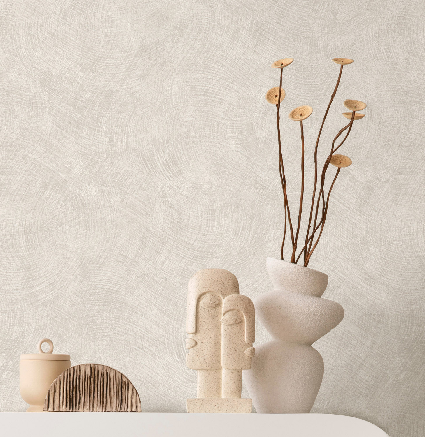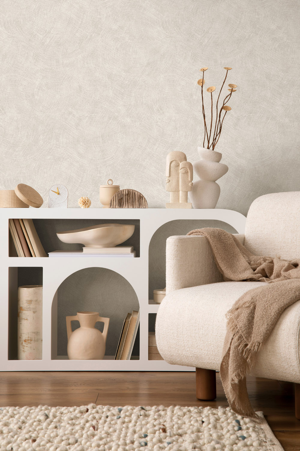 Ondala laat je muren zacht bewegen. Het patroon lijkt op vloeiende golven die over het oppervlak zijn geborsteld en geeft je ruimte meteen een rustige, elegante sfeer.