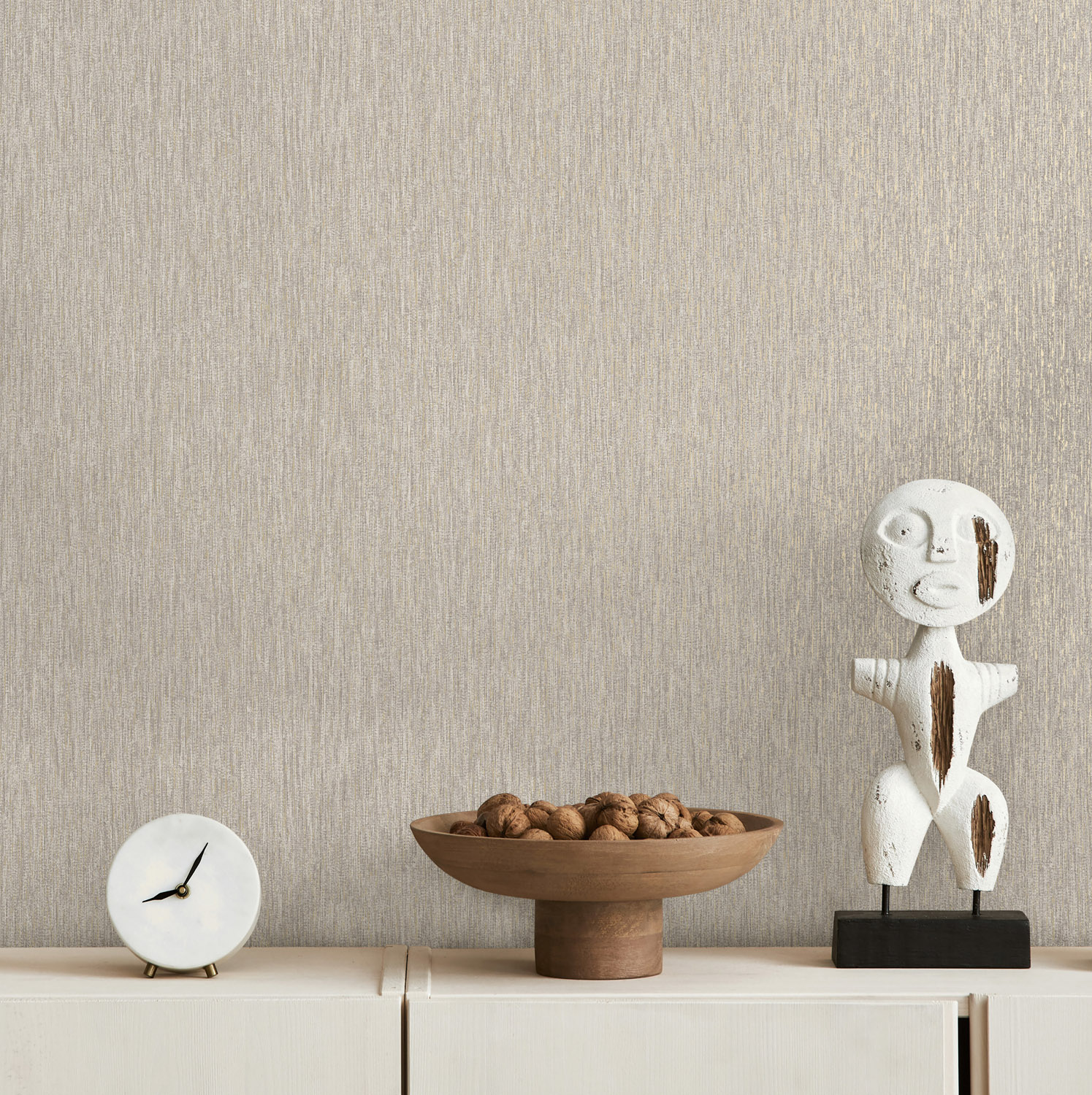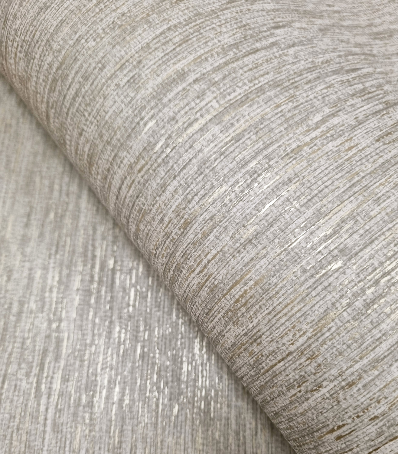 Textura heeft een strak, geweven lijnenspel dat doet denken aan riet. De structuur voelt zacht en natuurlijk, terwijl subtiele metallic accenten het ontwerp net dat beetje sprankeling geven.