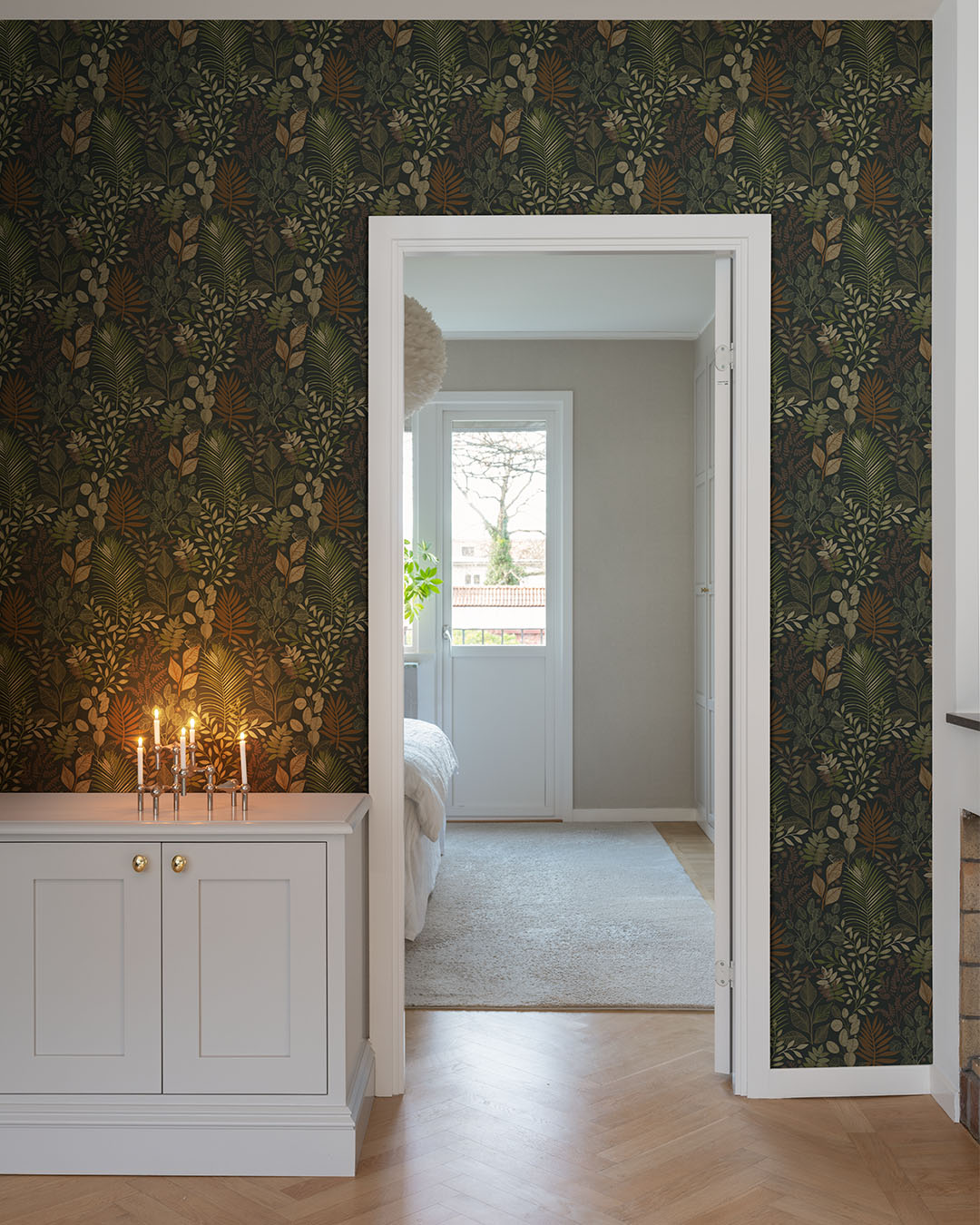 Het behang Ängslycka krijgt een krachtige uitstraling in dit donkere kleurenpalet. Tegen een zwarte achtergrond vormen bladeren in groen, beige, bruin en roest een levendig samenspel. Het patroon ademt de kalmerende energie van de natuur en brengt met de warme tinten een prettige harmonie in je interieur.