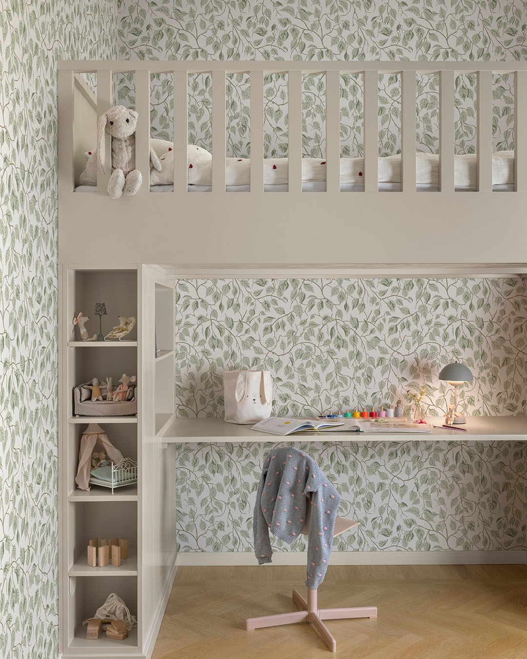 Behang Hängbjörk – ‘Hangende Berk’ – brengt een kalme, luchtige sfeer in huis. Op een frisse witte achtergrond waaieren lichte bladeren in beige en grijs subtiel uit, alsof ze zachtjes ritselen in de wind. Het patroon voelt licht en natuurlijk aan, en laat elke ruimte ademen.
