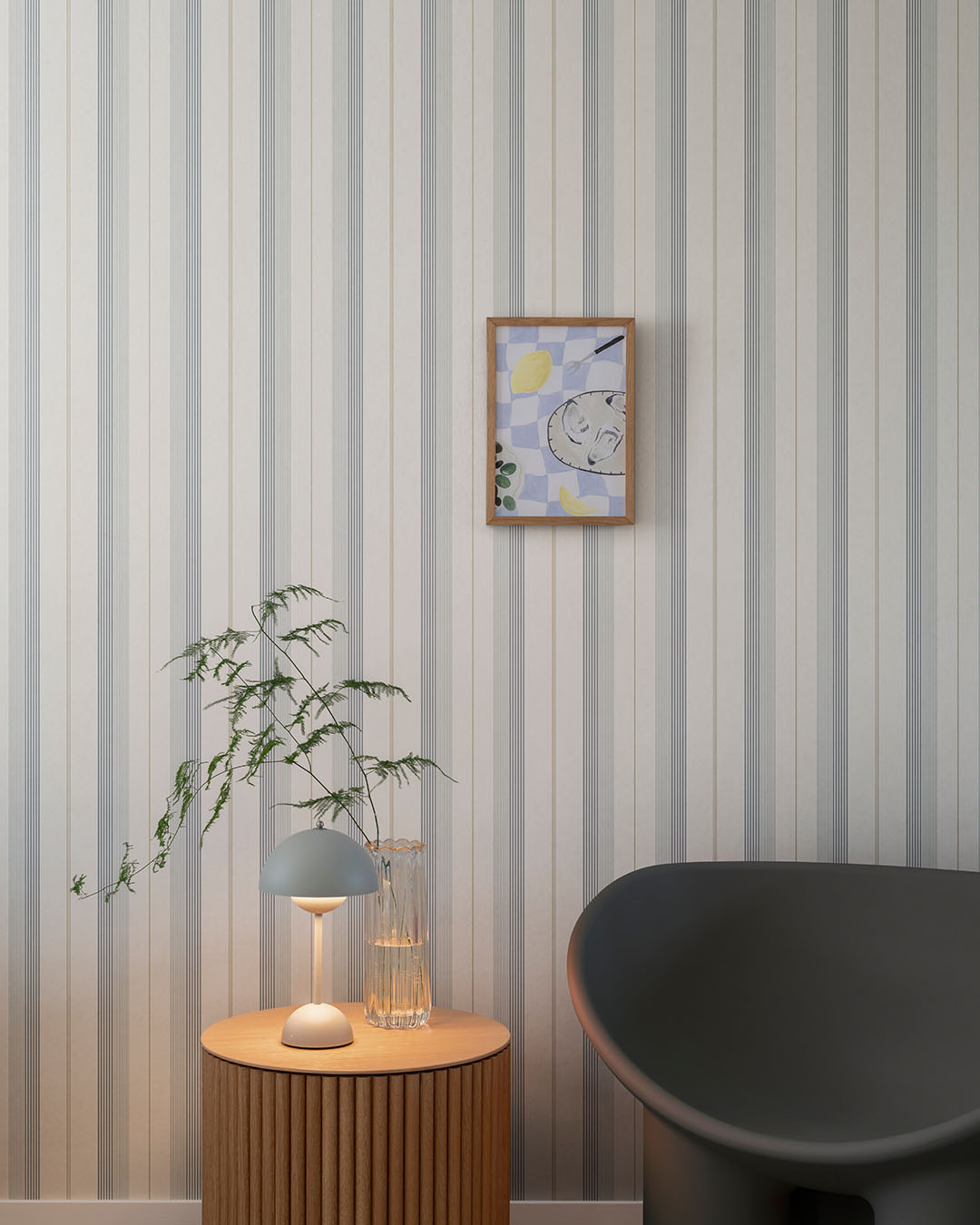 Behang Herrgård – Zweeds voor ‘Herenhuis’ – brengt met zijn donkergroene kleurstelling en fijne strepen in tinten groen en beige een rustige, warme sfeer in huis. De diepe kleur geeft de ruimte een knusse, elegante uitstraling en zorgt voor een tijdloos karakter dat in elk interieur tot zijn recht komt.