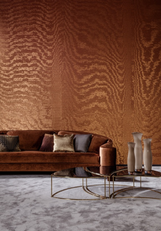 Verblindende zonnestralen op water en woestijnzand resulteren in golvende, hypnotiserende tekeningen en er ontstaat een moiré-effect op de glanzende stof. De motieven zijn volledig willekeurig waardoor elke muurbekleding uniek is.
