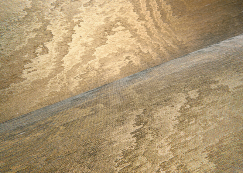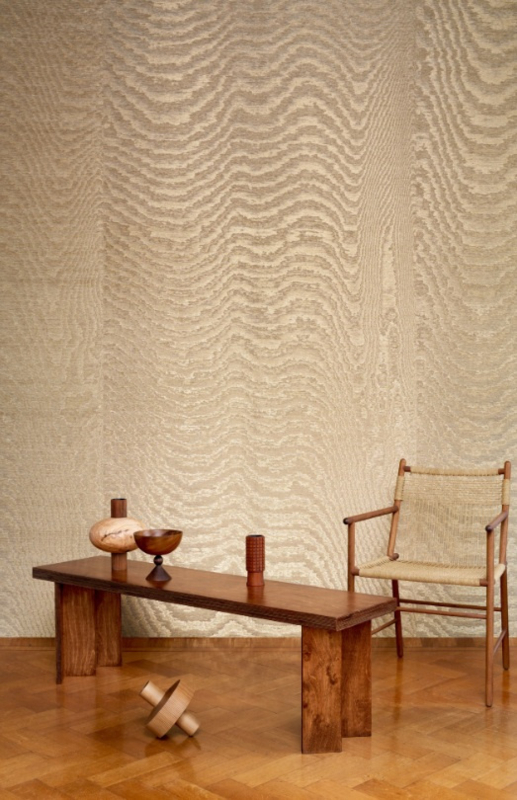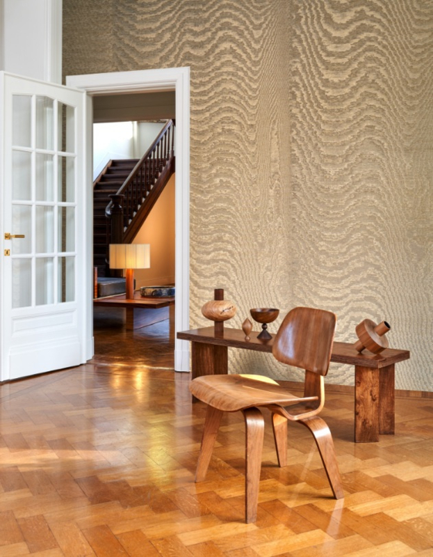 Verblindende zonnestralen op water en woestijnzand resulteren in golvende, hypnotiserende tekeningen en er ontstaat een moiré-effect op de glanzende stof. De motieven zijn volledig willekeurig waardoor elke muurbekleding uniek is.