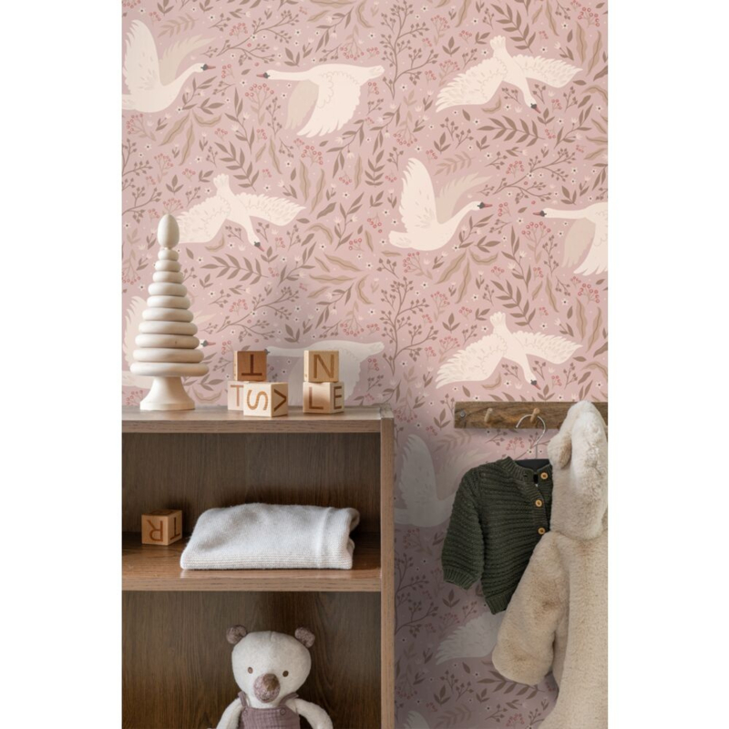 Creëer een warme en knusse sfeer met dit behang met zwanen in oudroze. Perfect voor een brocante of romantische stijl, dat een nostalgisch gevoel oproept en je laat wegdromen bij mooie herinneringen.