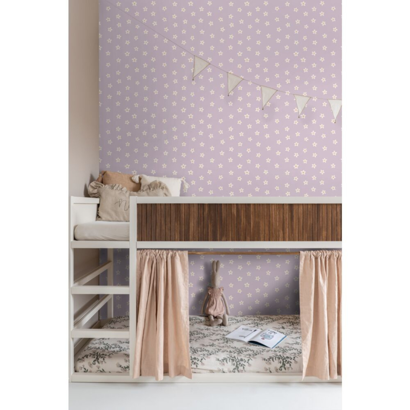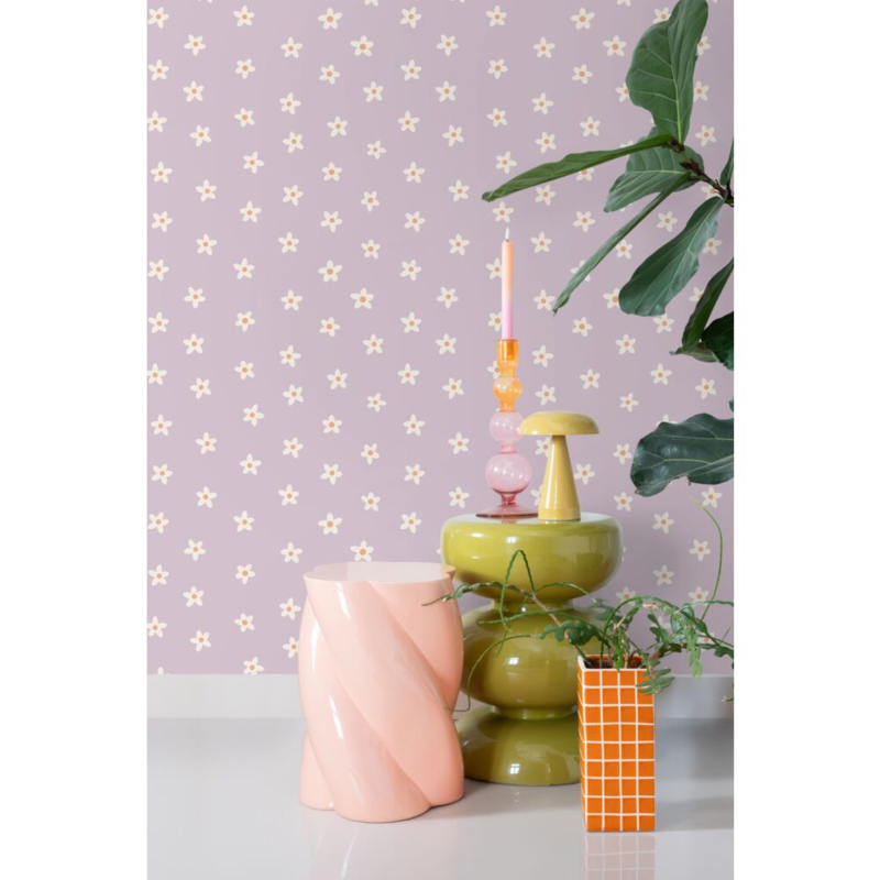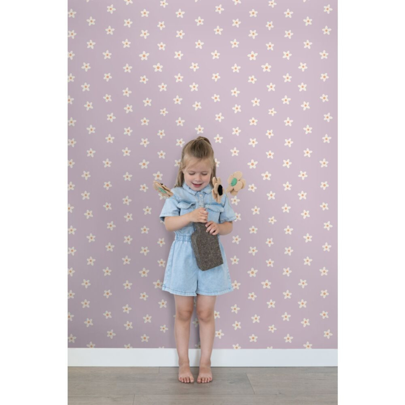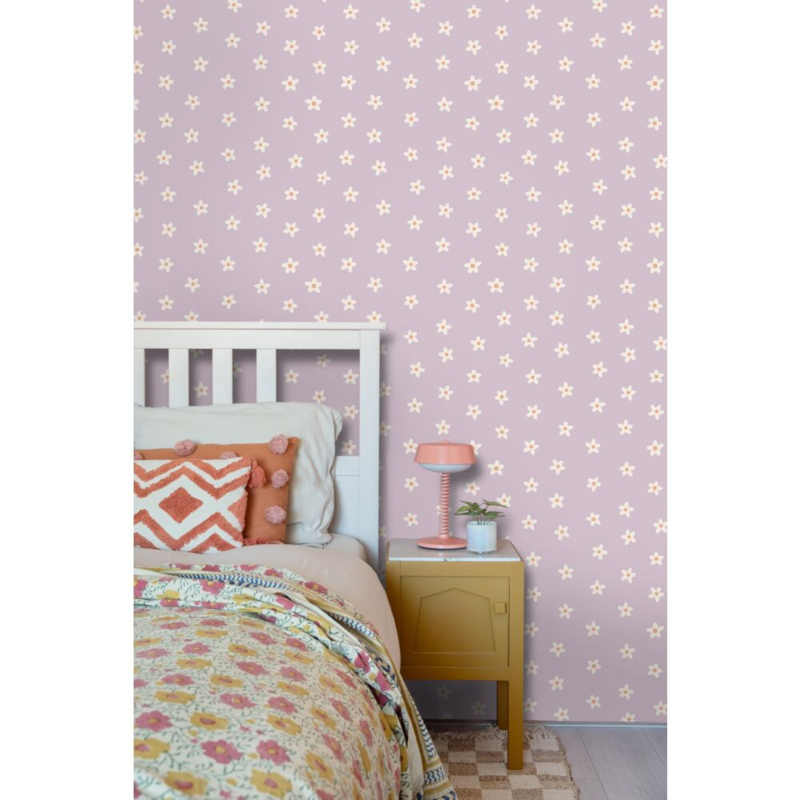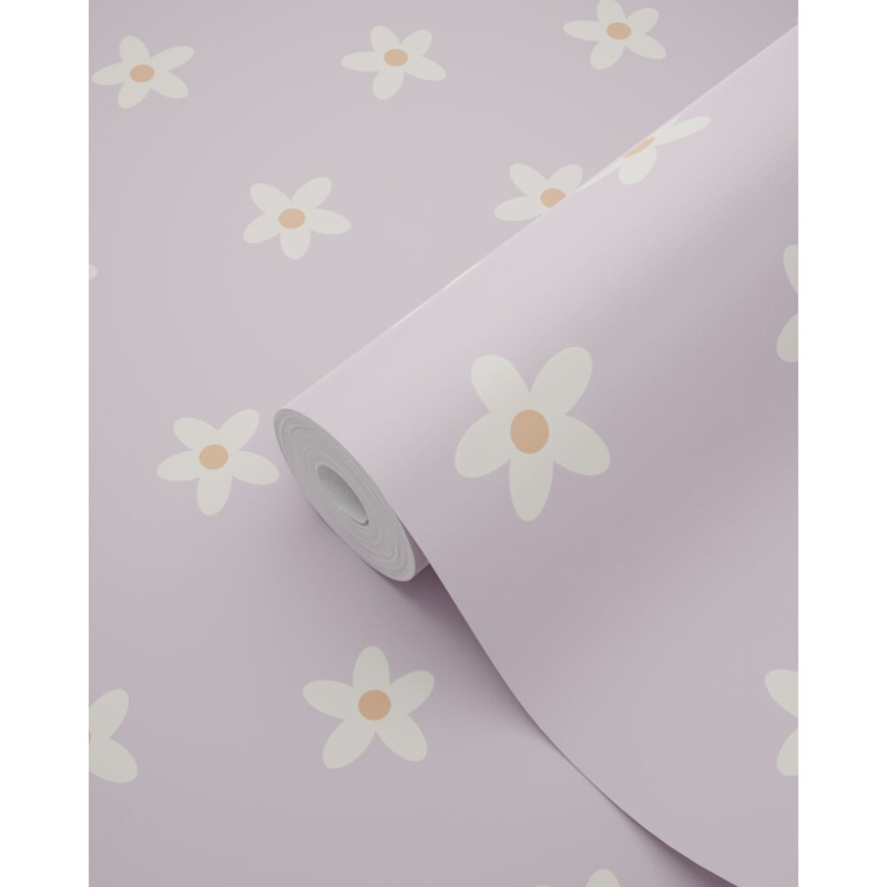 Met dit vrolijke meisjesbehang met lila paarse madeliefjes verander je iedere kamer in een knusse kinderkamer. In combinatie met lichte tinten en natuurlijke materialen ontstaat er een rustige, warme en gezellige sfeer.