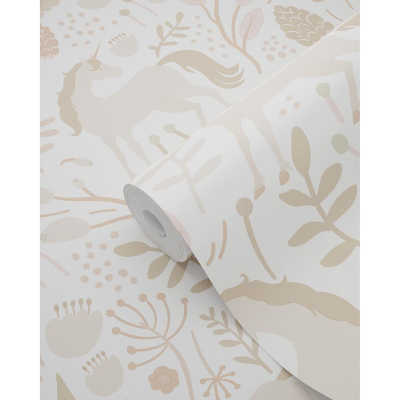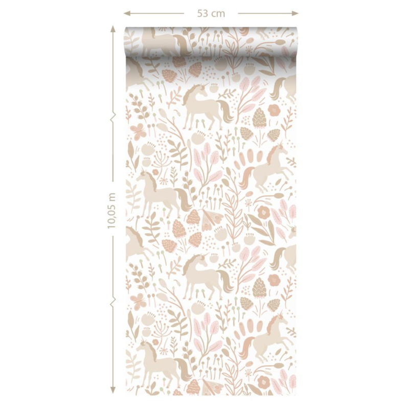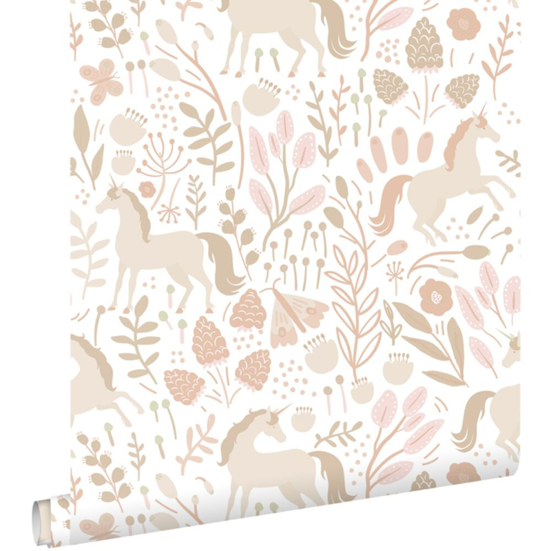 Tover de kinderkamer om tot een magische plek met dit trendy kinderbehang met unicorns in beige. Het behang brengt een warme, gezellige sfeer en laat zich prachtig combineren met lichte tinten en natuurlijke materialen.