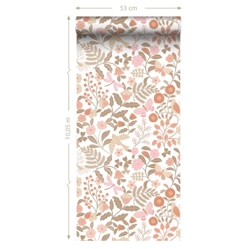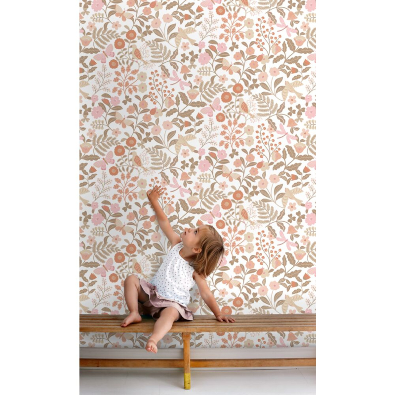 Met dit trendy meisjesbehang met bloemen en vogels in terracotta, taupe en roze maak je van elke kamer een knusse en gezellige kinderkamer. In combinatie met lichte kleuren en natuurlijke materialen ontstaat een rustige, warme en sfeervolle omgeving.