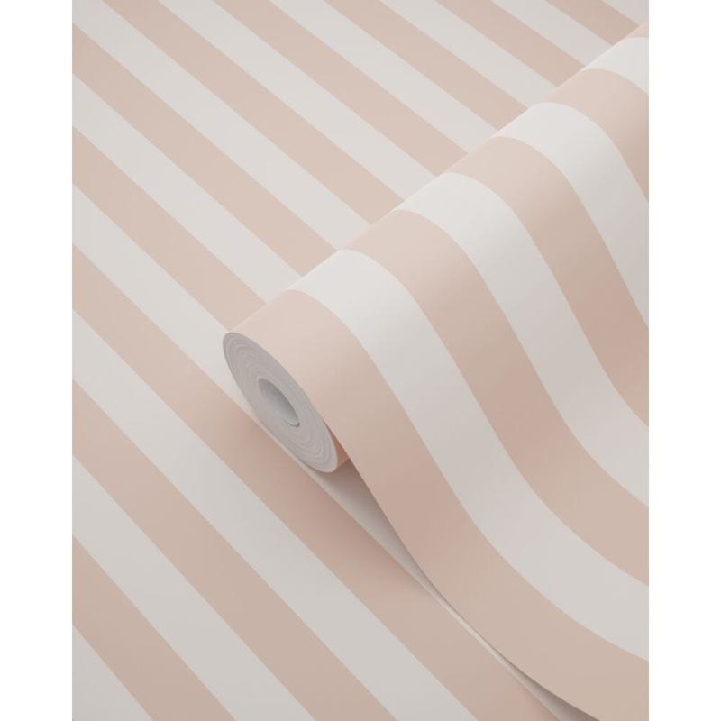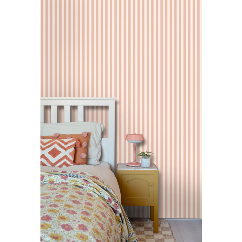 Met dit frisse behang met strepen in terracotta roze geef je je interieur meteen een speelse uitstraling. Laat je creativiteit de vrije loop en haal de levendige energie van kleur in huis.