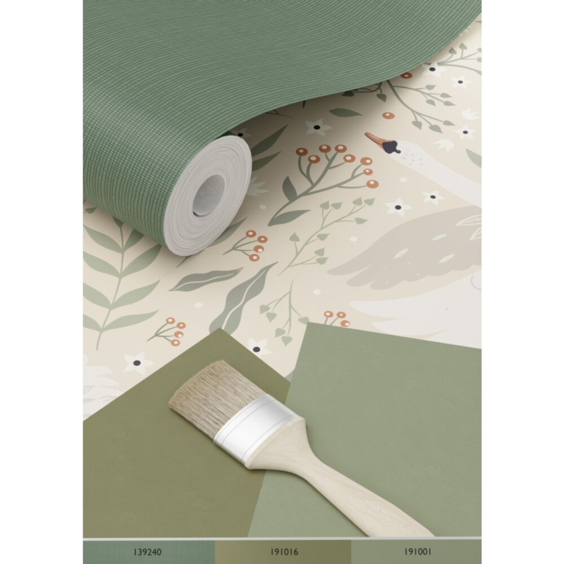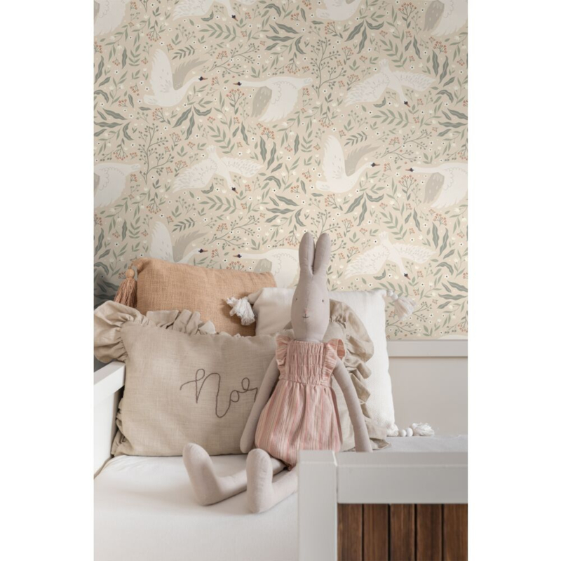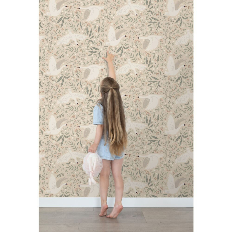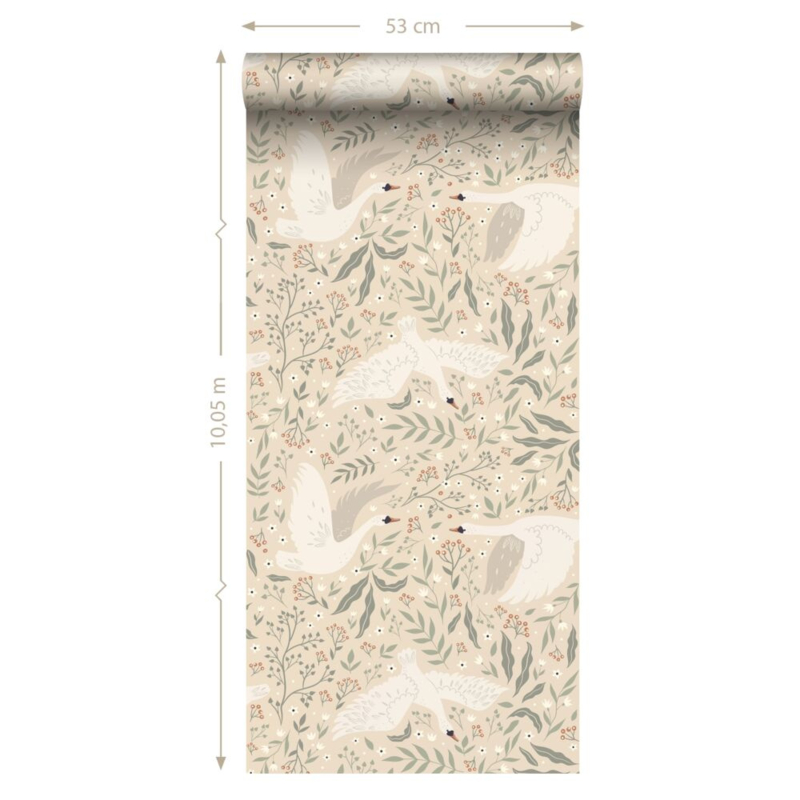 Tover de kinderkamer om tot een knusse en sfeervolle ruimte met dit trendy kinderbehang met zwanen in beige, wit en vergrijsd groen. Het behang creëert een warme, gezellige sfeer en combineert prachtig met lichte kleuren en natuurlijke materialen.