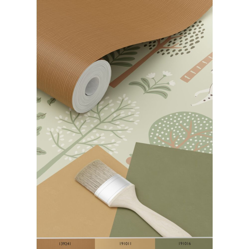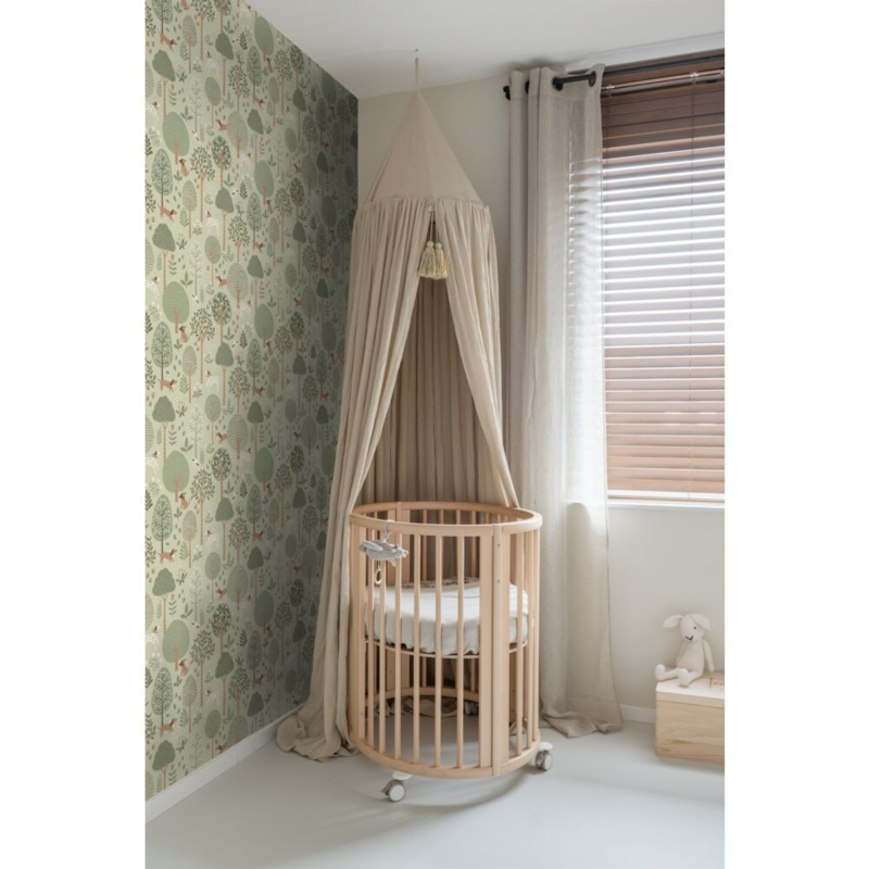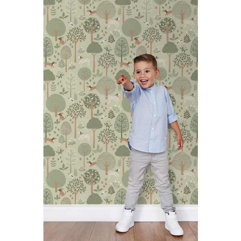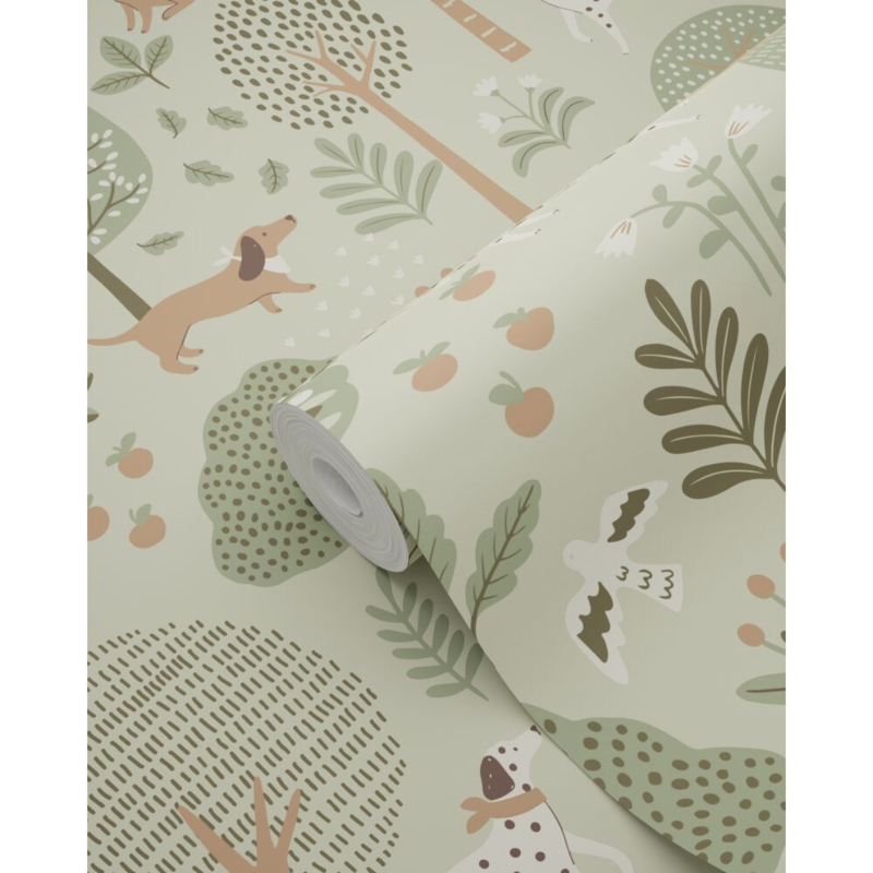 Tover de kinderkamer om tot een gezellige plek met dit trendy kinderbehang met honden in vergrijsd mintgroen. Het behang brengt een warme sfeer en laat zich prachtig combineren met lichte tinten en natuurlijke materialen.
