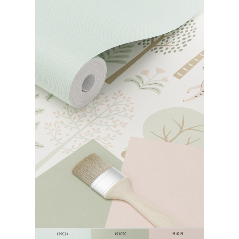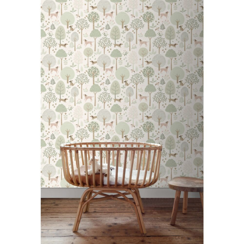 Tover de kinderkamer om tot een vrolijke en knusse ruimte met dit trendy kinderbehang met honden in vergrijsd mintgroen en wit. Het behang brengt een gezellige sfeer en combineert prachtig met lichte kleuren en natuurlijke materialen.