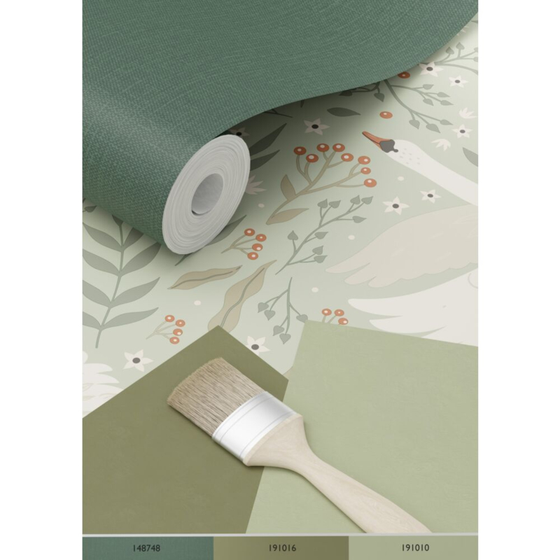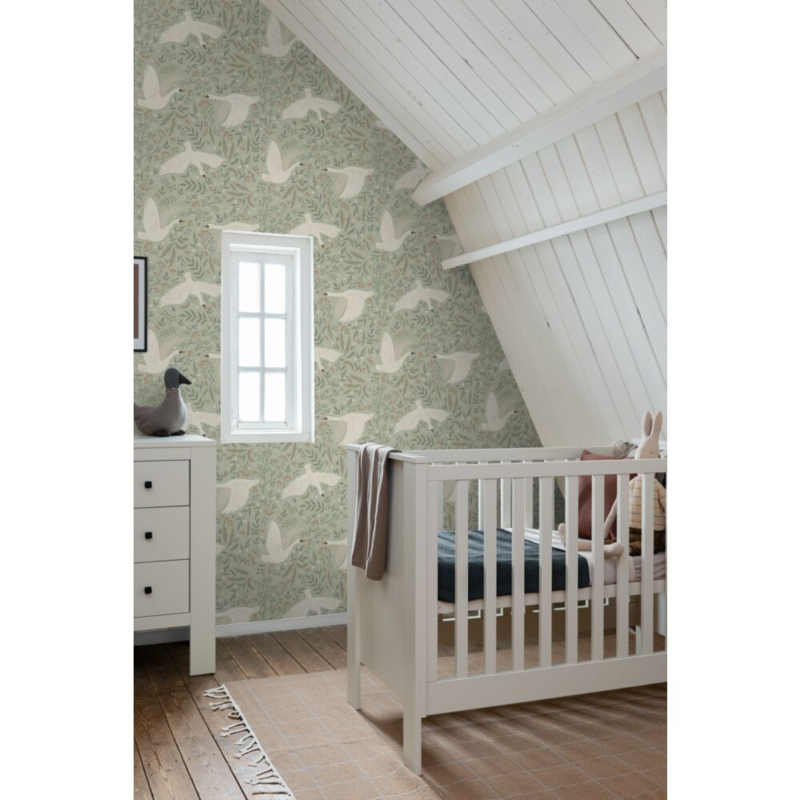 Met dit behang met zwanen in mintgroen breng je een warme en knusse sfeer in huis. Het sluit perfect aan bij een brocante, romantische woonstijl en roept een nostalgisch gevoel op dat je laat wegdromen naar dierbare momenten van vroeger.