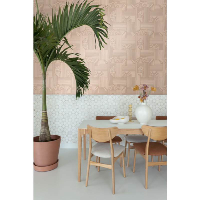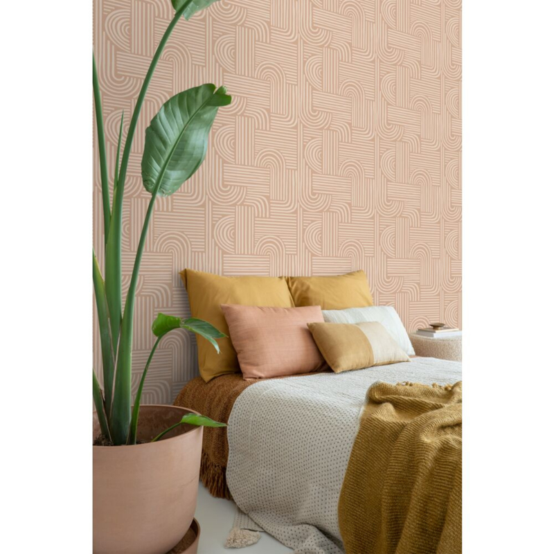 Dit prachtige behang met grafisch 3D-motief in licht terracotta verandert je muur in een echte eyecatcher. Perfect geschikt voor een opvallende accentmuur in een modern interieur.