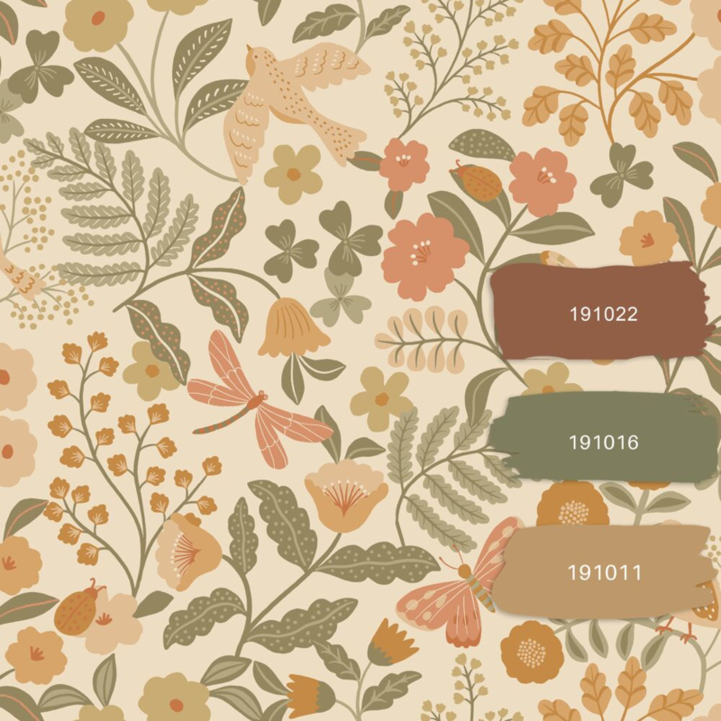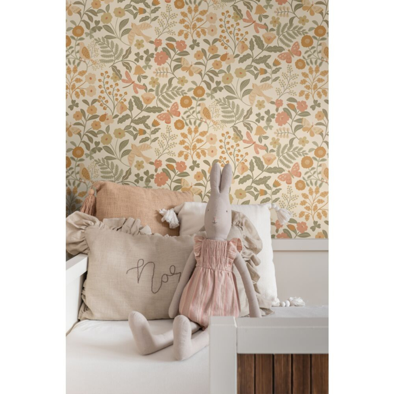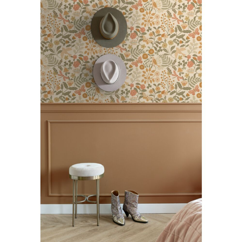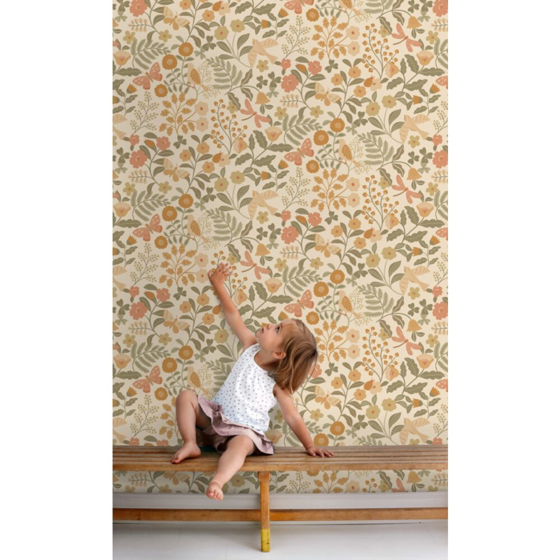 Met dit trendy meisjesbehang met bloemen en vogels in oranje en vergrijsd groen verander je iedere kamer in een knusse kinderkamer. In combinatie met lichte kleuren en natuurlijke materialen ontstaat een rustige, warme en gezellige sfeer.