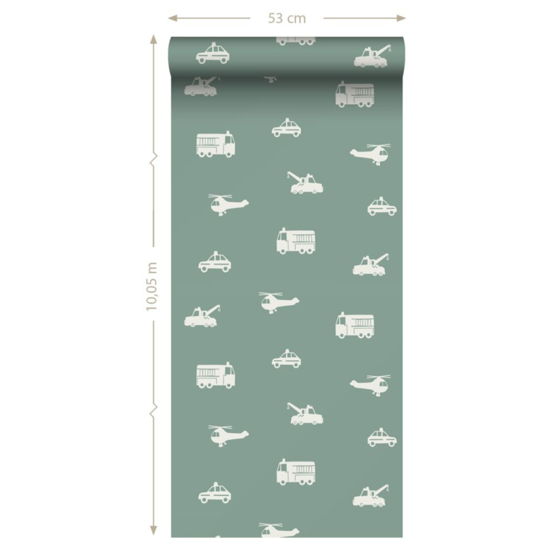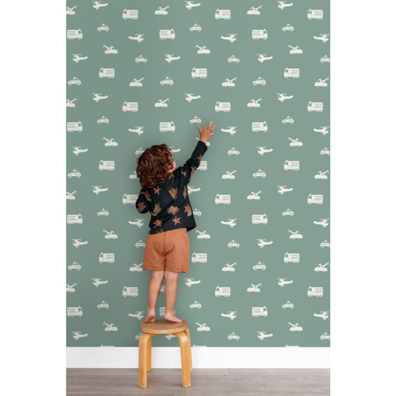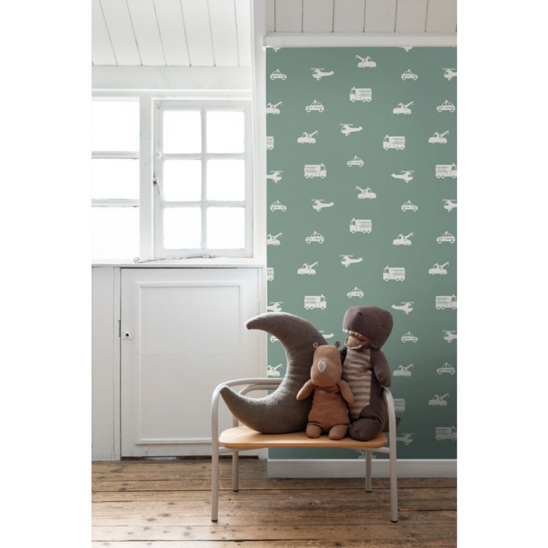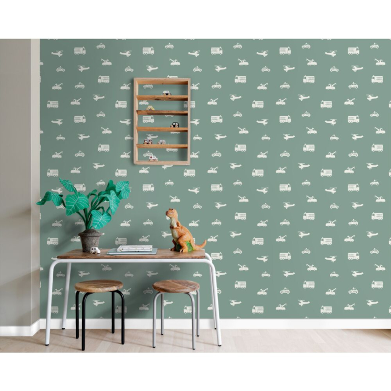 Maak van de jongenskamer een stoere en gezellige ruimte met dit trendy behang met auto’s, brandweerwagens, helikopters en kranen in vergrijsd blauw. Het behang zorgt voor een speelse sfeer en combineert prachtig met lichte kleuren en natuurlijke materialen.