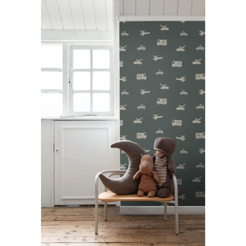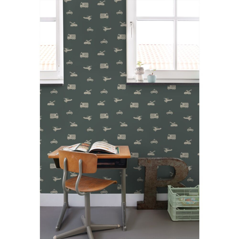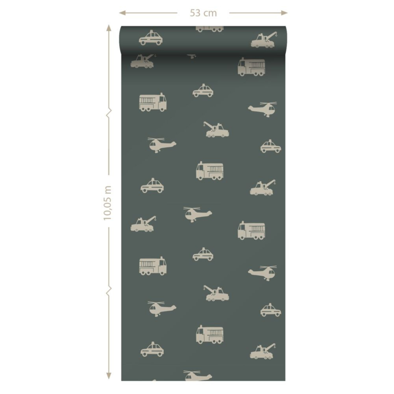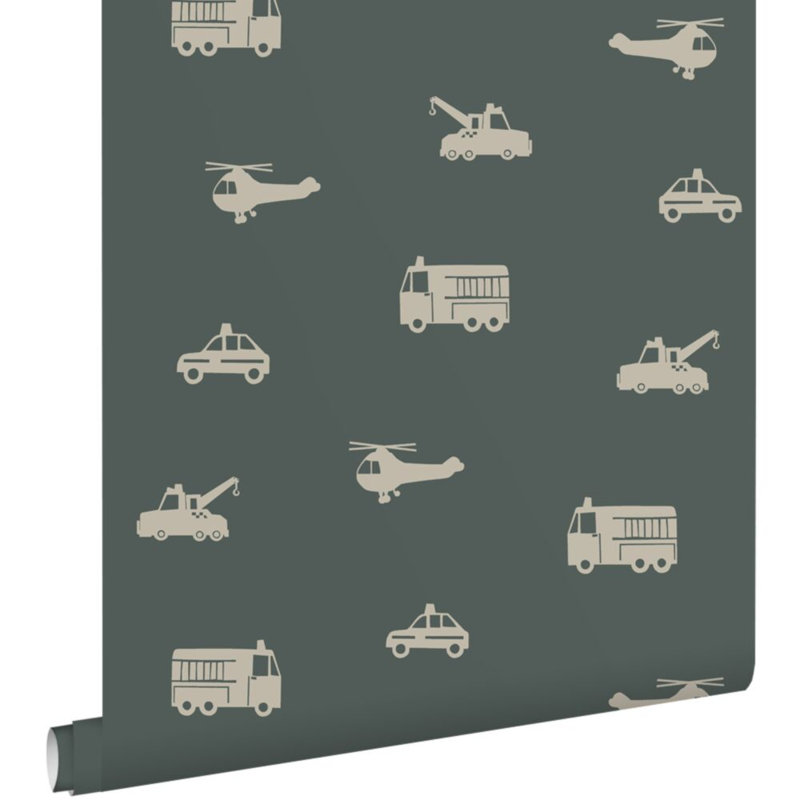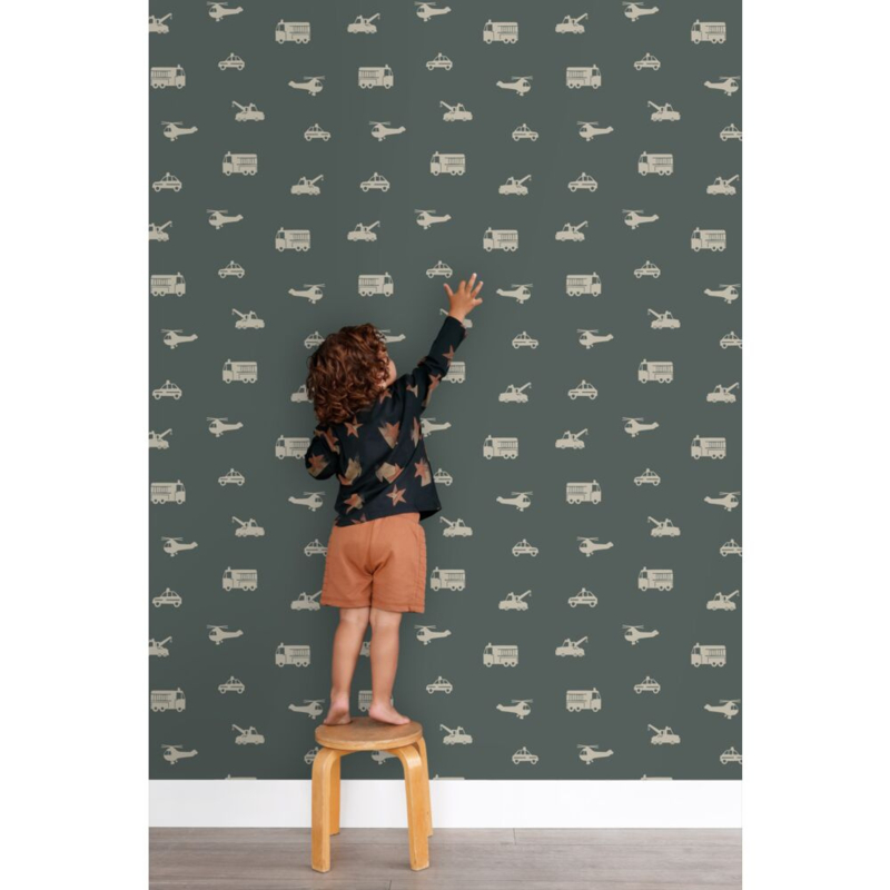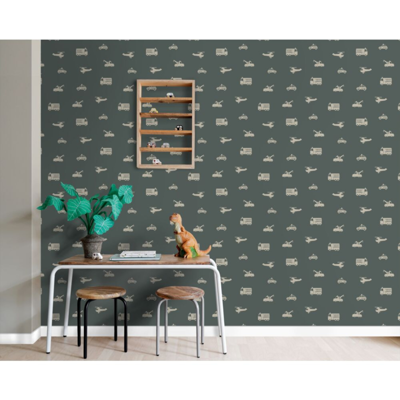 Maak van de jongenskamer een stoere en gezellige plek met dit trendy behang met auto’s, brandweerwagens, helikopters en kranen in taupe. Het behang brengt een speelse sfeer en laat zich uitstekend combineren met lichte kleuren en natuurlijke materialen.