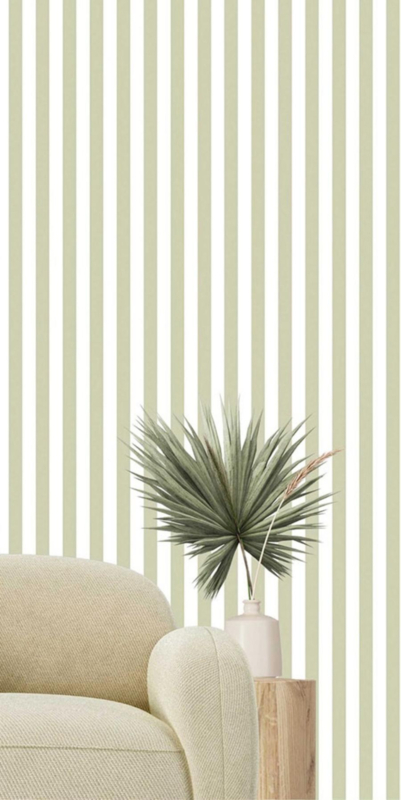 Het streepbehang in off-white en groen is eenvoudig te combineren met natuurlijke materialen en lichte meubels, waardoor een rustgevende en stijlvolle omgeving ontstaat.
