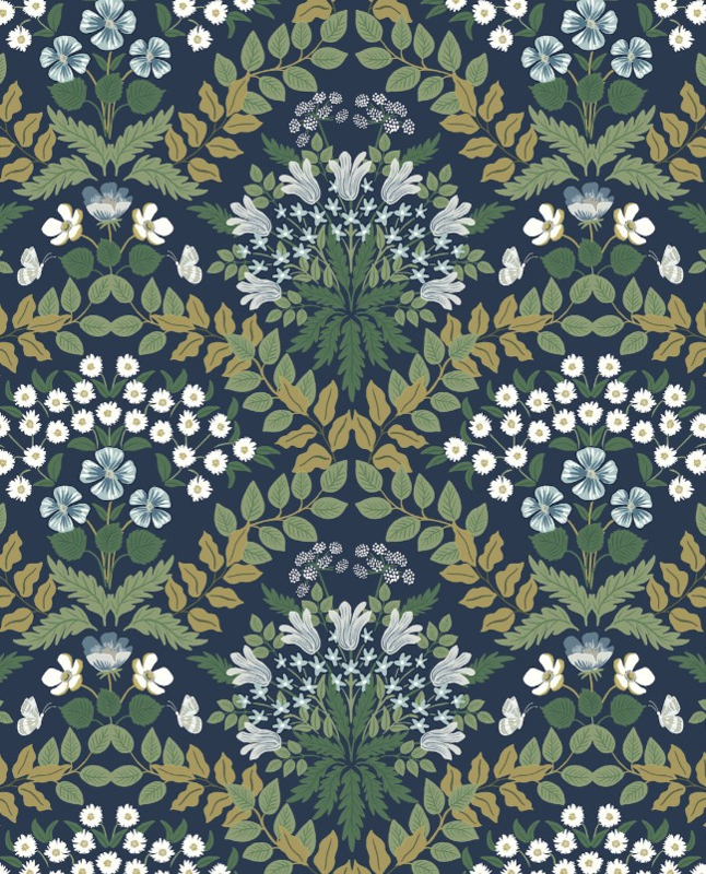 Het RP7324 Bramble behang uit de Rifle Paper Co Second Edition collectie is een verfijnd ontwerp dat botanische elementen combineert met Art Nouveau-invloeden. Het patroon toont een symmetrisch arrangement van bloemen en bladeren op een diepblauwe achtergrond, met groene accenten, wat zorgt voor een dramatische en elegante sfeer in elke ruimte.