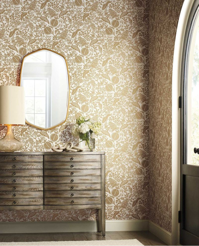 Breng een subtiele maar luxueuze uitstraling in je interieur met het Eijffinger Rifle Paper Co RP7391 – Pomegranate behang. Het ontwerp toont granaatappelbloesems en bladeren in verfijnde gouden accenten op een crème achtergrond, waardoor elke muur een stijlvolle en tijdloze sfeer krijgt.