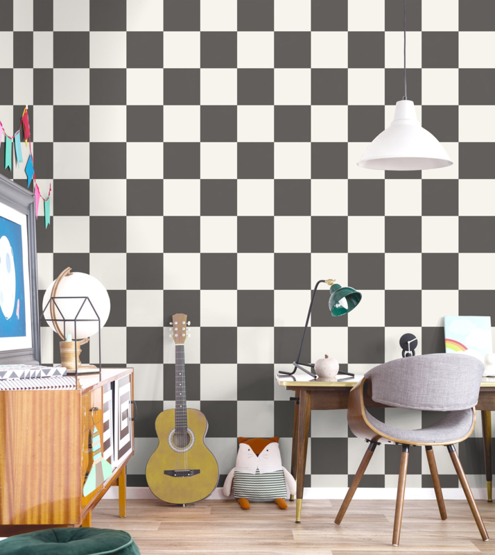 Breng stijl en speelsheid in de kinderkamer met het Check This Out! Charcoal 14040 papierbehang uit de Adventure Awaits collectie van Dutch Wallcoverings.