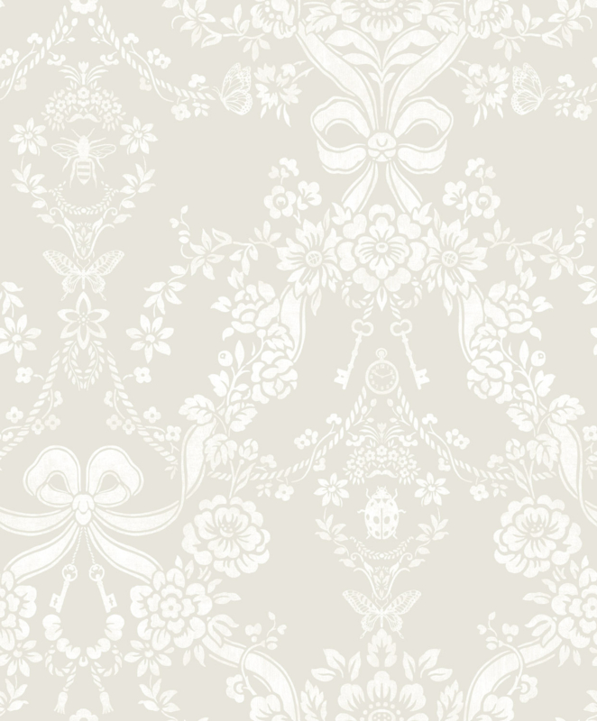 Het Bow Damask Taupe 14171 papierbehang uit de Imaginarium III collectie van Dutch Wallcoverings combineert klassieke elegantie met speelse details. Het tijdloze damastpatroon toont bloemen, bijen, ooievaars en subtiele strikken in harmonieuze taupetinten, waardoor elke muur een verfijnde en sfeervolle uitstraling krijgt.