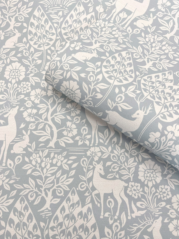 Dit verfijnde ontwerp toont herten en konijnen die zich bewegen in een stil boslandschap, omlijst door bomen en subtiele details. De blauwe tinten en zachte linnenstructuur geven het patroon een rustige, verfijnde uitstraling, perfect voor een serene en sfeervolle inrichting.