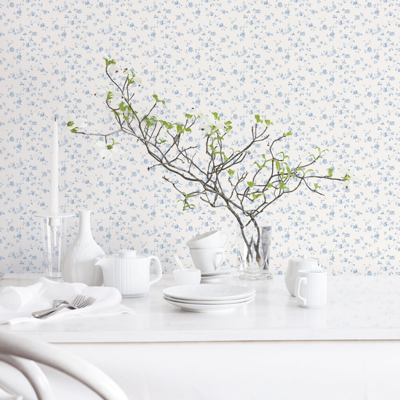 Vliesbehang met fijn bloemendessin in zachtblauw en wit