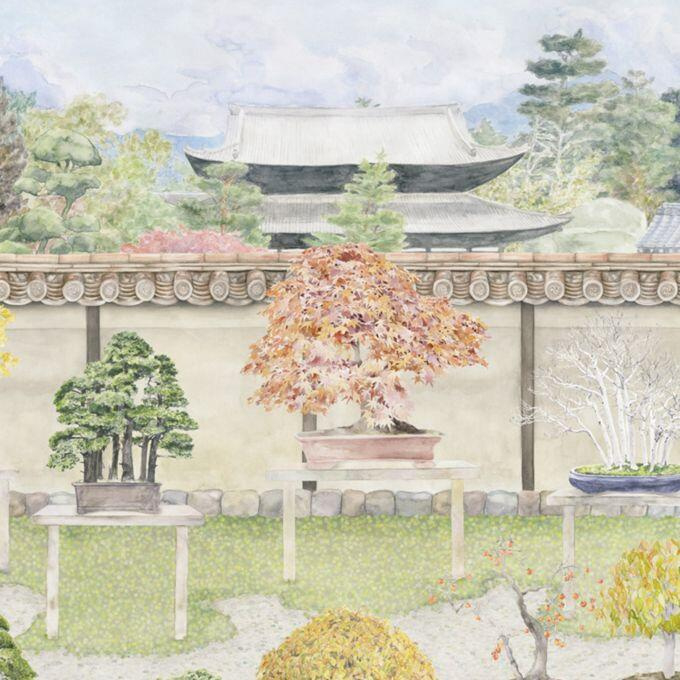 Het verfijnde kleurenspel van zacht bladgroen, poederige tinten en natuurlijke nuances roept een serene sfeer op die doet denken aan de zentuinen van Kyoto. De handgetekende details en gelaagde compositie geven het ontwerp een indrukwekkende diepte, waardoor het lijkt alsof de bomen rechtstreeks uit het landschap tot leven komen.
