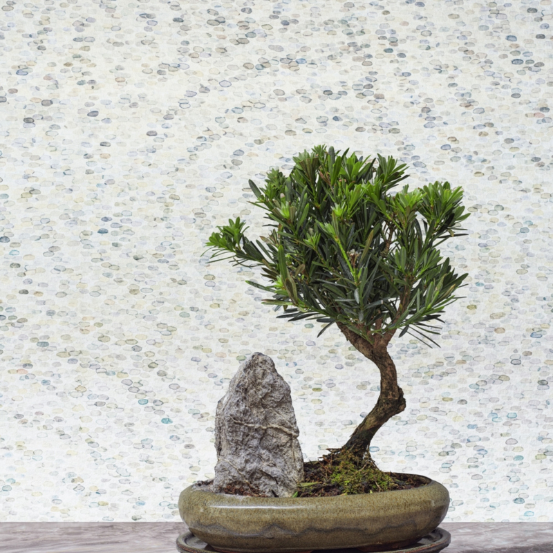 Het rotsformatiepatroon lijkt door de ruimte te zweven en geeft een dynamisch maar rustig ritme dat perfect past in zowel moderne als klassieke interieurs. De neutrale, natuurlijke tinten maken het behang veelzijdig en makkelijk te combineren met andere ontwerpen uit de Shinrin Yoku-collectie, zoals Kaki Persimmon of Bonsai Garden, maar het komt ook prachtig tot zijn recht als losstaand statementontwerp.