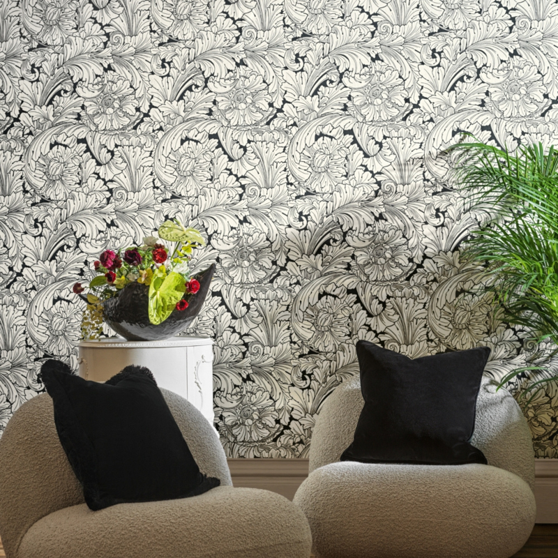 Geef je interieur een krachtige, tijdloze en elegante sfeer met Cole & Son Acanthus Soot & Snow 127/6032 – een stijlvol behang dat moeiteloos luxe uitstraalt.