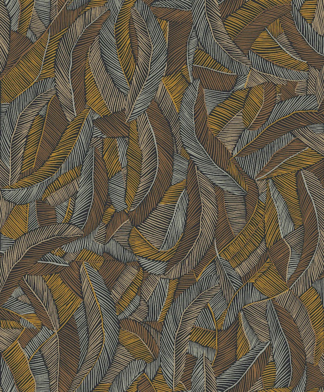 Masureel Pennas Ceylon ROM202 uit de Romance collectie geeft je interieur een opvallende, elegante uitstraling. Het ontwerp toont overlappende bladeren in bruin, goud, zilvergrijs en geel op een diepe zwarte achtergrond, voor een rijke, dynamische look.
