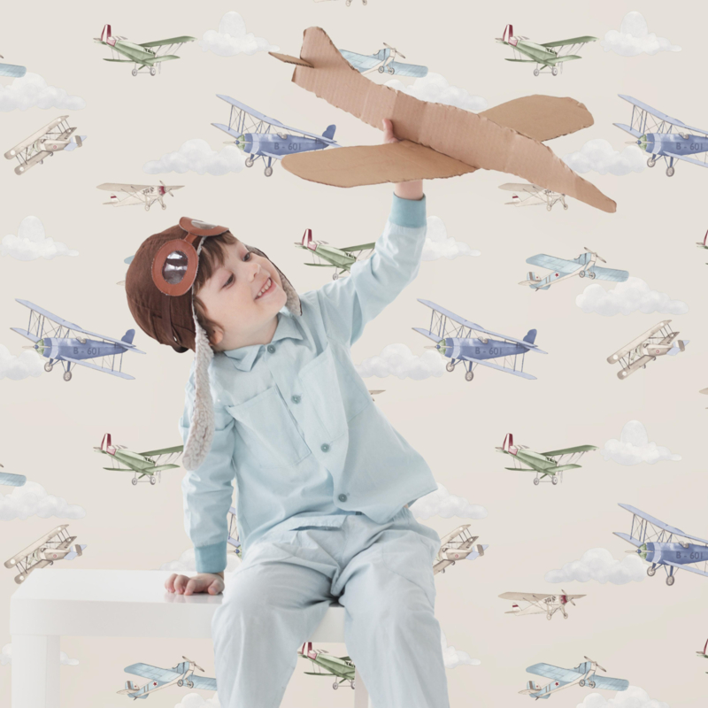 - Speels ontwerp met vliegtuigen en wolken voor een fantasierijke kinderkamer