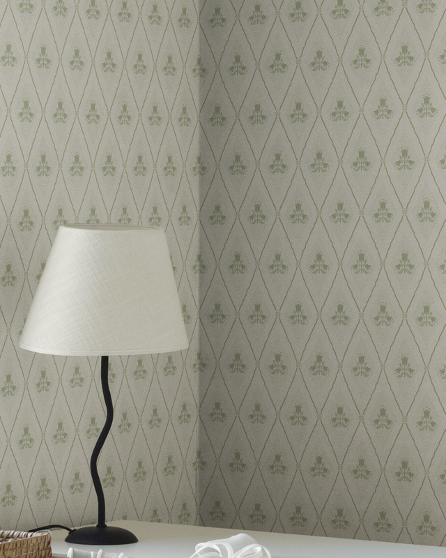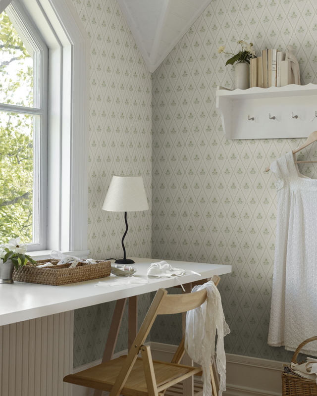 - Wit behang met groen trellispatroon voor een frisse, lichte uitstraling