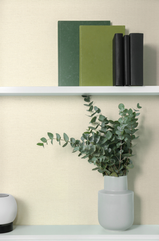 De delicate textuur geeft de wand een tastbare diepte en een natuurlijke uitstraling, alsof er een fijn geweven stof over de muur is gelegd. Perfect als rustige basiswand of gecombineerd met een expressief dessin uit dezelfde collectie.