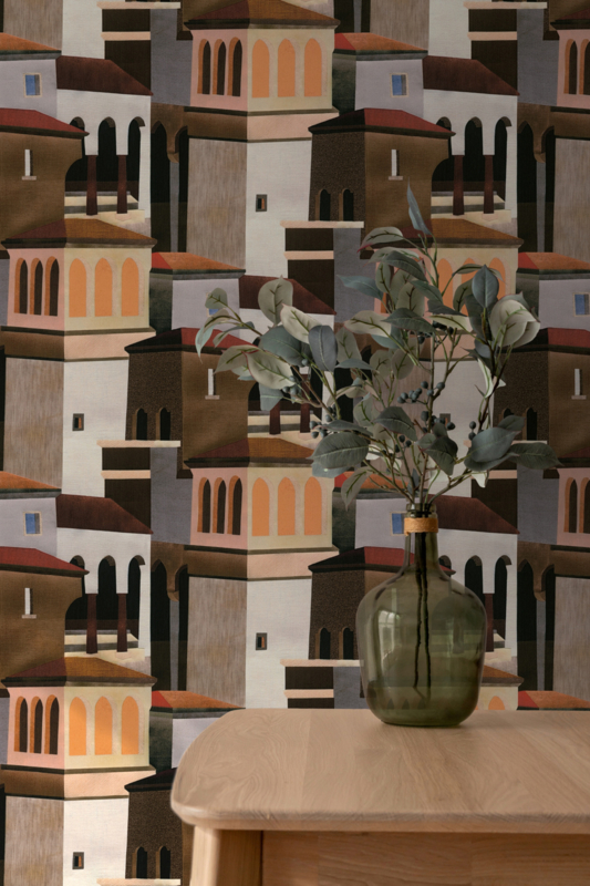 Het kleurenpalet van bruin, crème, grijs, zwart, beige en gele accenten zorgt voor een warme en eigentijdse uitstraling die makkelijk te combineren is met diverse interieurstijlen. Perfect als accentmuur of in combinatie met effen behang uit dezelfde collectie.