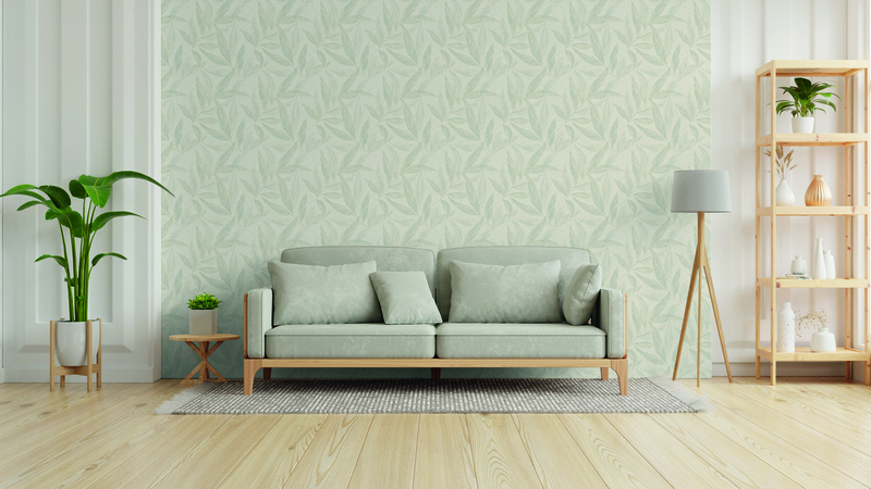 - Subtiel bladmotief in zachtgroen en zilvergrijs voor een natuurlijke uitstraling