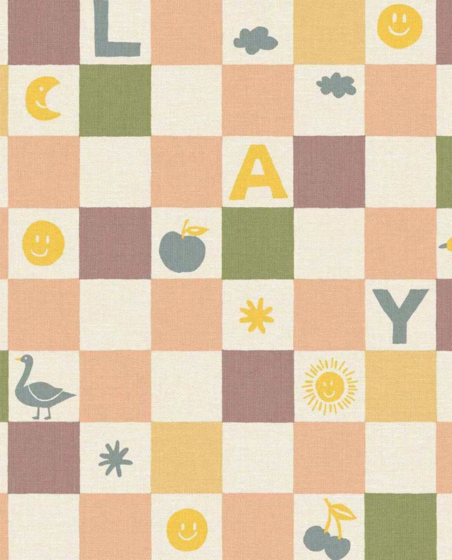 - Vrolijk en creatief ruitpatroon met letters, fruit en wolkjes