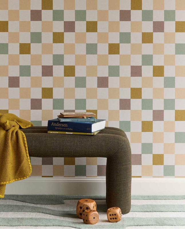 Zacht, warm en vol charme: dit ruitbehang uit de Tiny Treasures collectie van Eijffinger geeft de kinderkamer een knusse basis met karakter. De combinatie van beige, frisse groentinten en warme bruintinten zorgt voor een natuurlijke, rustige uitstraling die zowel comfort als sfeer toevoegt.