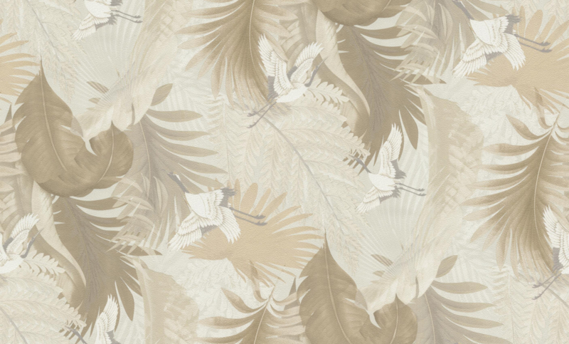 Voeg een vleugje luxe en exotische elegantie toe aan je interieur met behang 73824. Sierlijke tropische bladeren en gracieuze kraanvogels bewegen over zachte beige- en crèmetinten, waardoor elke ruimte direct een stijlvolle en levendige sfeer krijgt.