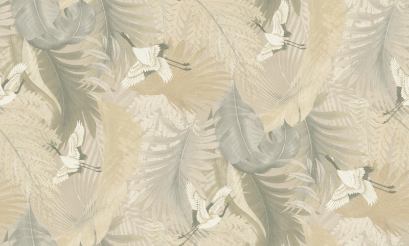 Laat je muren tot leven komen met behang 73825 uit de Dutch First Class Tendenze collectie. Sierlijke kraanvogels dwarrelen tussen tropische bladeren in zachte beige-, grijs- en crèmetinten, terwijl een lichte structuur subtiel diepte en luxe toevoegt. Dit dessin geeft je interieur een tijdloze, exotische flair die elegantie en karakter combineert.