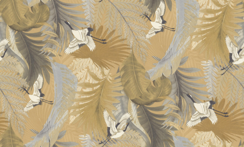 Breng een levendige en stijlvolle sfeer in huis met behang 73822 uit de Dutch First Class Tendenze collectie. Dit bijzondere dessin combineert sierlijke tropische bladeren met elegante kraanvogels in zachte geel-, grijs- en blauwtinten, waardoor een harmonieus en verfijnd geheel ontstaat. De kleurenmix creëert een frisse, exotische uitstraling die direct karakter toevoegt aan iedere ruimte.