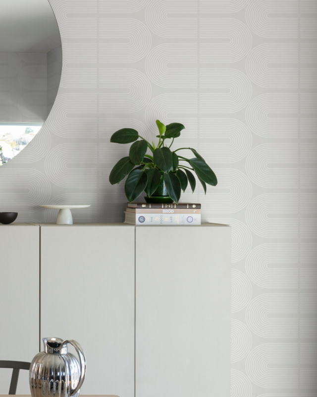 Breng een rustige en stijlvolle sfeer in je interieur met behang 32111 uit de Dutch First Class Grafico collectie. Het patroon van zachte, verhoogde witte bogen op een lichtgrijze achtergrond combineert klassieke architectuur met moderne grafische elegantie. De ronde passages en vloeiende lijnen creëren een subtiel ritme dat de muur dynamiek en diepte geeft zonder te overheersen.