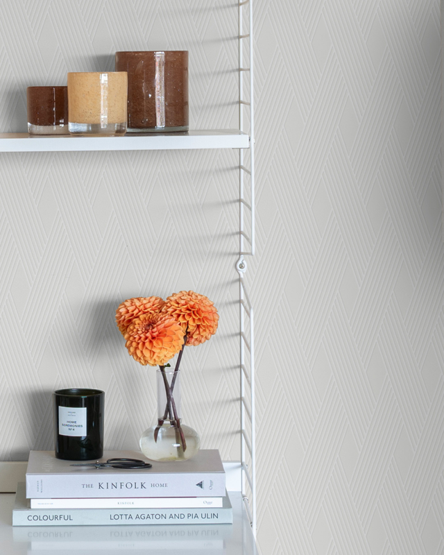 De licht verhoogde lijnen vangen het daglicht op een subtiele manier, waardoor een reliëfachtig effect ontstaat dat gedurende de dag steeds anders oogt. Zo krijgt de muur een levendige textuur die diepte en verfijning toevoegt zonder de ruimte te domineren. Perfect voor moderne, minimalistische en elegante interieurs waar een rustige maar stijlvolle basis gewenst is.