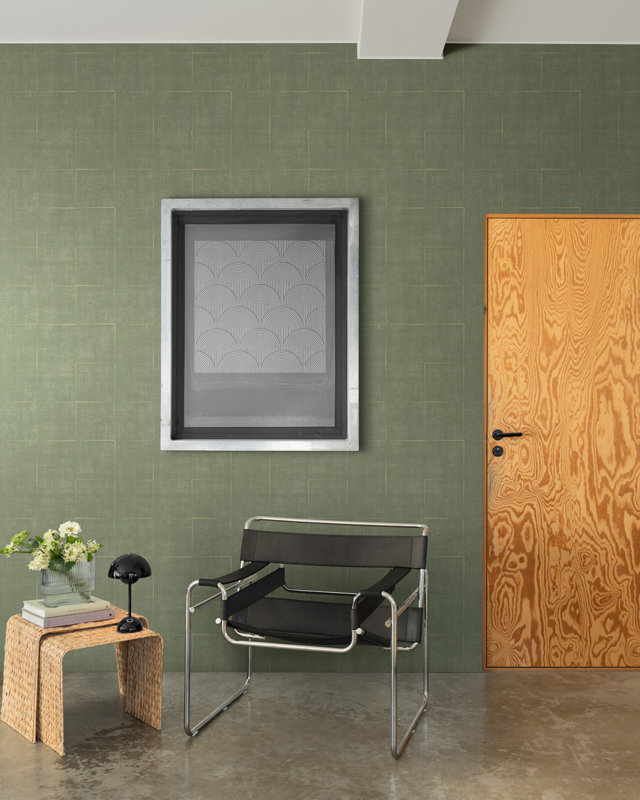 Breng grafische elegantie en natuurlijke warmte in je interieur met het Göteborg 32117 behang van Dutch First Class. De olijfgroene kleur met subtiele textielstructuur geeft diepte en tactiliteit aan de muur, terwijl een netwerk van royale, licht verschoven vierkanten een ritme van lijnen en hoeken creëert dat tegelijk grafisch en speels oogt.