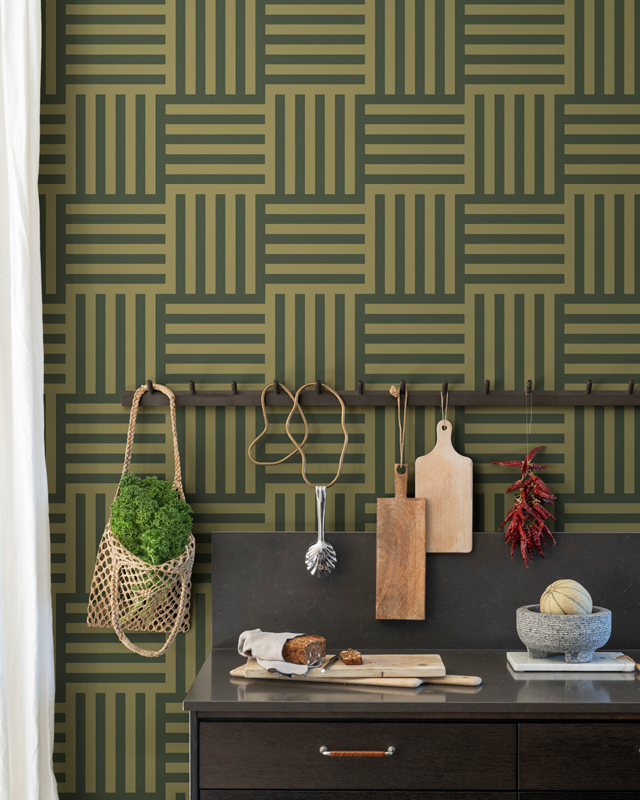 De rechte lijnen lopen parallel, onderbreken bij scherpe hoeken en vervolgen hun weg, waardoor elke sectie een eigen expressie krijgt, terwijl het geheel rustig en gebalanceerd blijft. Perfect voor accentwanden of volledige kamers die een grafisch statement met elegantie nodig hebben.